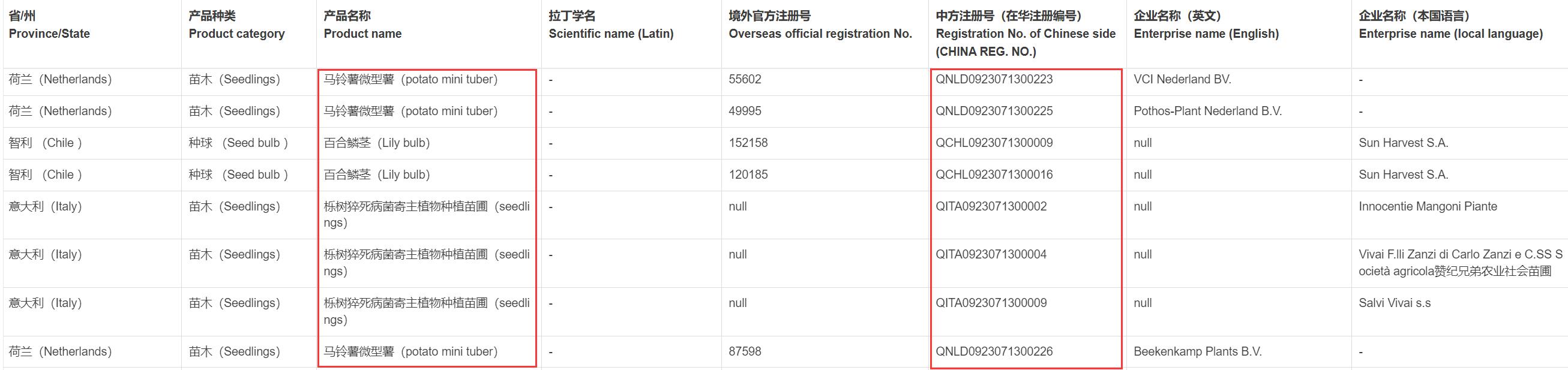 Foreign plantations (nurseries) exporting plant propagation materials to China must register with Chinese customs. If necessary, Chinese customs may dispatch quarantine personnel for pre-inspection or investigation of the origin's disease situation. Foreign phytosanitary authorities should assess nurseries and recommend qualified nurseries to Chinese customs. Chinese customs will review applications, conduct on-site inspections if necessary, and register the nurseries upon approval. The list of registered companies will be published on the official website of Chinese customs.